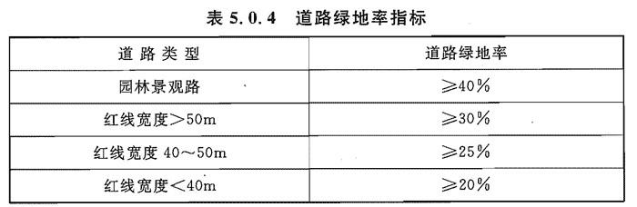 5.0.4 城市道路绿地率指标应符合表5.0.4的规定。