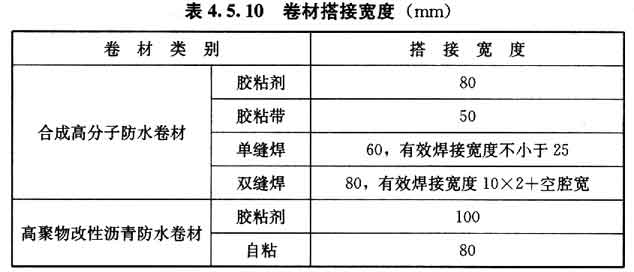 4.5.10 防水卷材接缝应采用搭接缝,卷材搭接宽度应符合表4.5.10的规定。