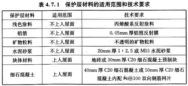 4.7.1 上人屋面保护层可采用块体材料、细石混凝土等材料,不上人屋面保护层可采用浅色涂料、铝箔、矿物粒料、水泥砂浆等材料。保护层材料的适用范围和技术要求应符合表4.7.1的规定。