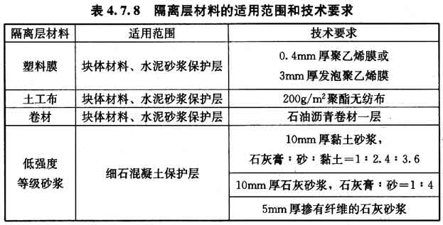 4.7.8 块体材料、水泥砂浆、细石混凝土保护层与卷材、涂膜防水层之间,应设置隔离层。隔离层材料的适用范围和技术要求宜符合表4.7.8的规定。