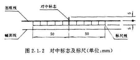 第2.1.2条 需要缩微后存档或复制的图纸,图框四边均应具有位于图幅长边、短边中点的对中标志(图2.1.1),并应在下图框线的外侧,绘制一段长100mm标尺,其分格为10mm。对中标志的线宽宜采用大于或等于0.5mm、标尺线的线宽宜采用0.25mm的实线绘制(图2.1.2)。