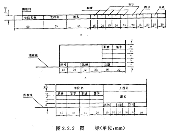第2.2.1条 图标应布置在图框内右下角(图2.1.1)。图标外框线线宽宜为0.7mm;图标内分格线线宽宜为0.25mm。