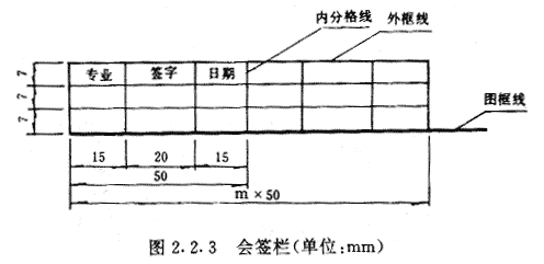 第2.2.3条 会签栏宜布置在图框外左下角(图2.1.1),并应按图2.2.3绘制。会签栏外框线线宽宜为0.5mm;内分格线线宽宜为0.25mm。