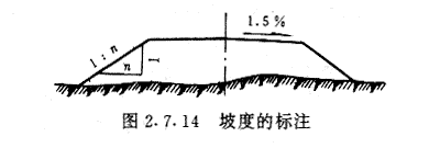 第2.7.14条 当坡度值较小时,坡度的标注宜用百分率表示,并应标注坡度符号。坡度符号应由细实线、单边箭头以及在其上标注百分数组成。坡度符号的箭头应指向下坡。当坡度值较大时,坡度的标注宜用比例的形式表示,例如1∶n(图2.7.14)。