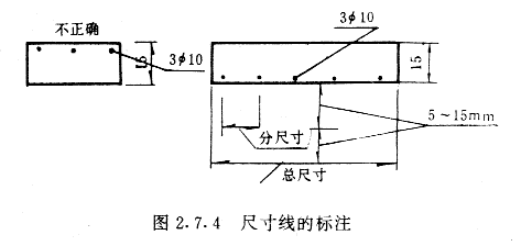 第2.7.4条 尺寸线必须与被标注长度平行,不应超出尺寸界线,任何其它图线均不得作为尺寸线。在任何情况下,图线不得穿过尺寸数字。相互平行的尺寸线应从被标注的图形轮廓线由近向远排列,平行尺寸线间的间距可在5~15mm之间。分尺寸线应离轮廓线近,总尺寸线应离轮廓线远(图2.7.4)。