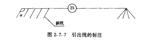 第2.7.7条 引出线的斜线与水平线应采用细实线,其交角α可按90°、120°、135°、150°绘制。当视图需要文字说明时,可将文字说明标注在引出线的水平线上(图2.7.6)。当斜线在一条以上时,各斜线宜平行或交于一点(图2.7.7)。