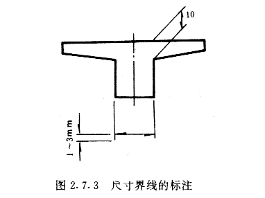 第2.7.3条 尺寸界线的一端应靠近所标注的图形轮廓线,另一端宜超出尺寸线1~3mm。图形轮廓线、中心线也可作为尺寸界线。尺寸界线宜与被标注长度垂直;当标注困难时,也可不垂直,但尺寸界线应相互平行(图2.7.3)。
