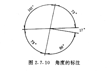 第2.7.10条 角度尺寸线应以圆弧表示。角的两边为尺寸界线。角度数值宜写在尺寸线上方中部。当角度太小时,可将尺寸线标注在角的两条边的外侧。角度数字宜按图2.7.10标注。