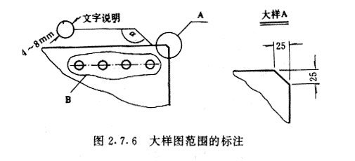 第2.7.6条 当用大样图表示较小且复杂的图形时,其放大范围,应在原图中采用细实线绘制圆形或较规则的图形圈出,并用引出线标注(图2.7.6)。