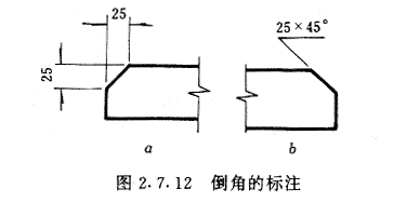 第2.7.12条 倒角尺寸可按图2.7.12a标注,当倒角为45°时,也可按图2.7.12b标注。