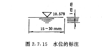 第2.7.15条 水位符号应由数条上长下短的细实线及标高符号组成。细实线间的间距宜为1mm(图2.7.15)。其标高的标注应符合本标准第2.7.13条的规定。