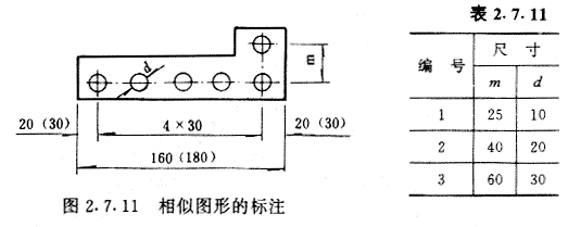 二、两个相似图形可仅绘制一个。未示出图形的尺寸数字可用括号表示。如有数个相似图形,当尺寸数值各不相同时,可用字母表示,其尺寸数值应在图中适当位置列表示出(表2.7.11)。