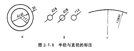 第2.7.8条 半径与直径可按图2.7.8a标注。当圆的直径较小时,半径与直径可按图2.7.8b标注;当圆的直径较大时,半径尺寸的起点可不从圆心开始(图2.7.8c)。半径和直径的尺寸数字前,应标注“r(R)”、或“d(D)”(图2.7.8b)。