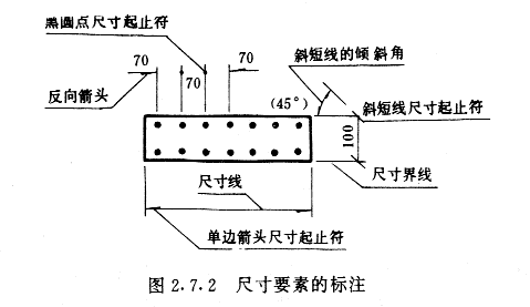 第2.7.1条 尺寸应标注在视图醒目的位置。计量时,应以标注的尺寸数字为准,不得用量尺直接从图中量取。尺寸应由尺寸界线、尺寸线、尺寸起止符和尺寸数字组成。