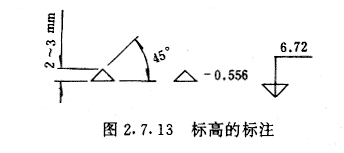 第2.7.13条 标高符号应采用细实线绘制的等腰三角形表示。高为2~3mm,底角为45°。顶角应指至被注的高度,顶角向上、向下均可。标高数字宜标注在三角形的右边。负标高应冠以“—”号,正标高(包括零标高)数字前不应冠以“+”号。当图形复杂时,也可采用引出线形式标注(图2.7.13)。
