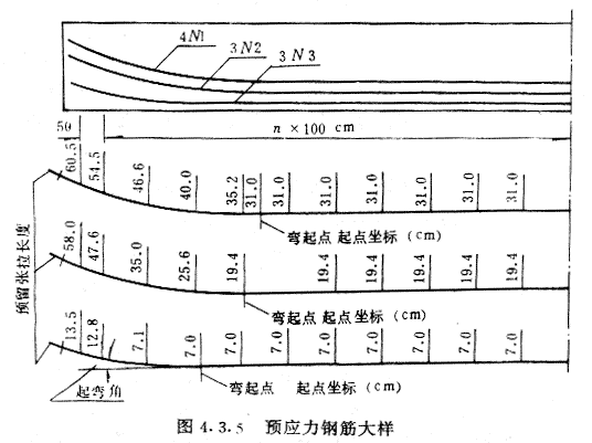 第4.3.5条 对弯起的预应力钢筋应列表或直接在预应力钢筋大样图中,标出弯起角度、弯曲半径切点的坐标(包括纵弯或既纵弯又平弯的钢筋)及预留的张拉长度(图4.3.5)。
