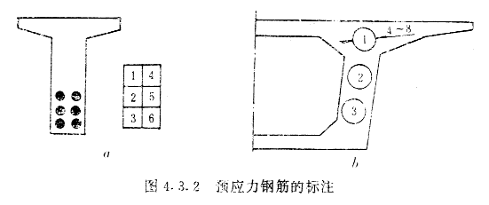 第4.3.4条 预应力钢筋在图中的几种表示方法应符合下列规定: