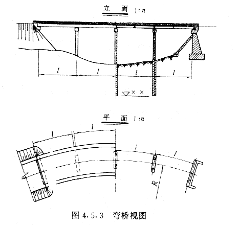 一、当全桥在曲线范围内时,应以通过桥长中点的平曲线半径为对称线;立面或纵断面应垂直对称线,并以桥面中心线展开后进行绘制(图4.5.3)。