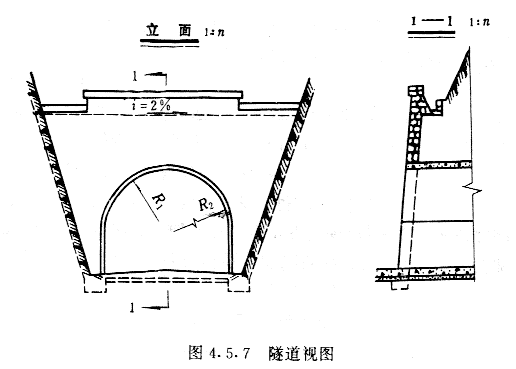 第4.5.7条 隧道洞门的正投影应为隧道立面。无论洞门是否对称均应全部绘制。洞顶排水沟应在立面图中用标有坡度符号的虚线表示。隧道平面与纵断面可仅示洞口的外露部分(图4.5.7)。