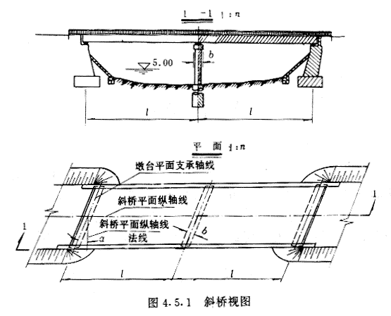 第4.5.2条 当绘制斜板桥的钢筋构造图时,可按需要的方向剖切。当倾斜角较大而使图面难以布置时,可按缩小后的倾斜角值绘制,但在计算尺寸时,仍应按实际的倾斜角计算。