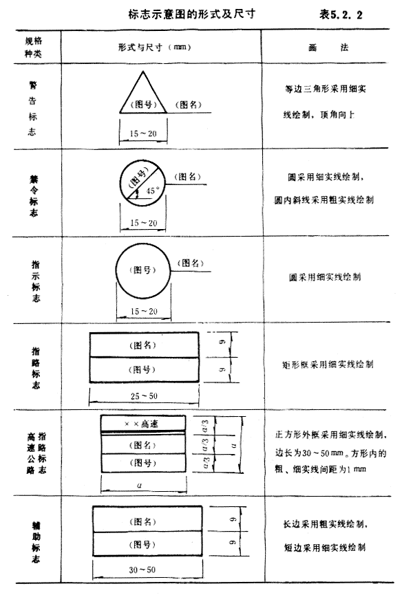 第5.2.2条 在路线或交叉口平面图中应示出交通标志的位置。标志宜采用细实线绘制。标志的图号、图名,应采用现行的国家标准《道路交通标志和标线》规定的图号、图名。标志的尺寸及画法应符合表5.2.2的规定。