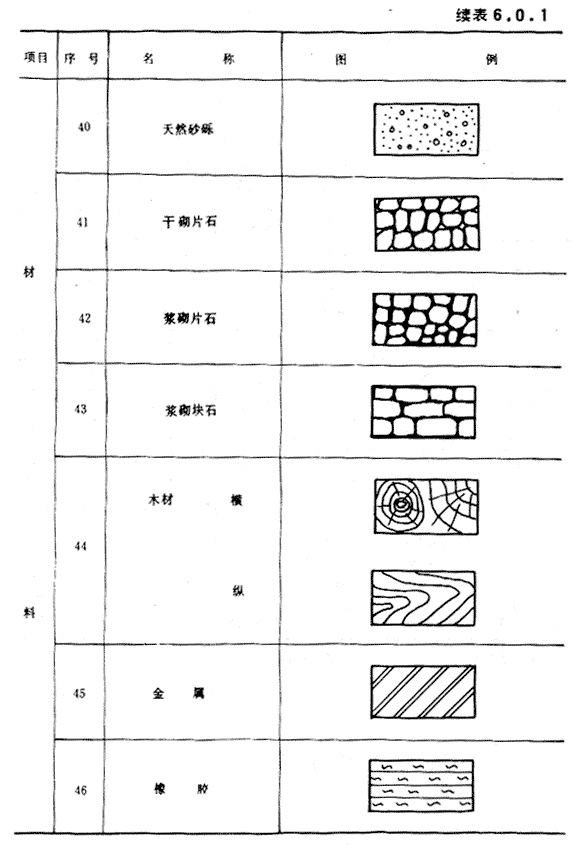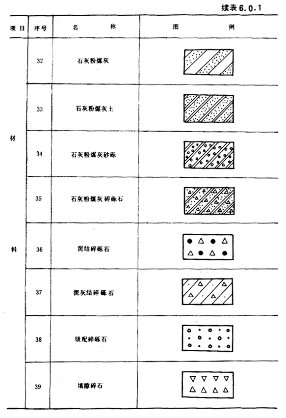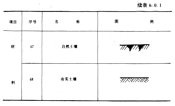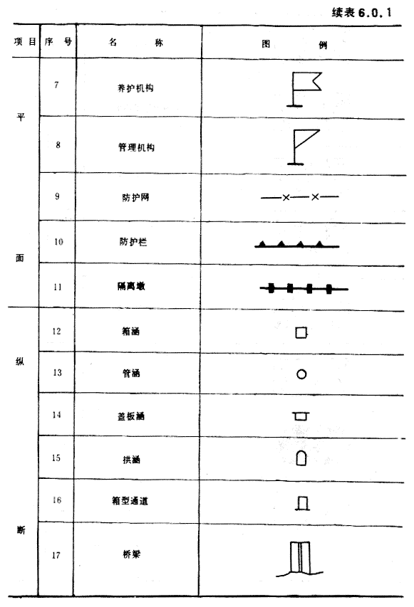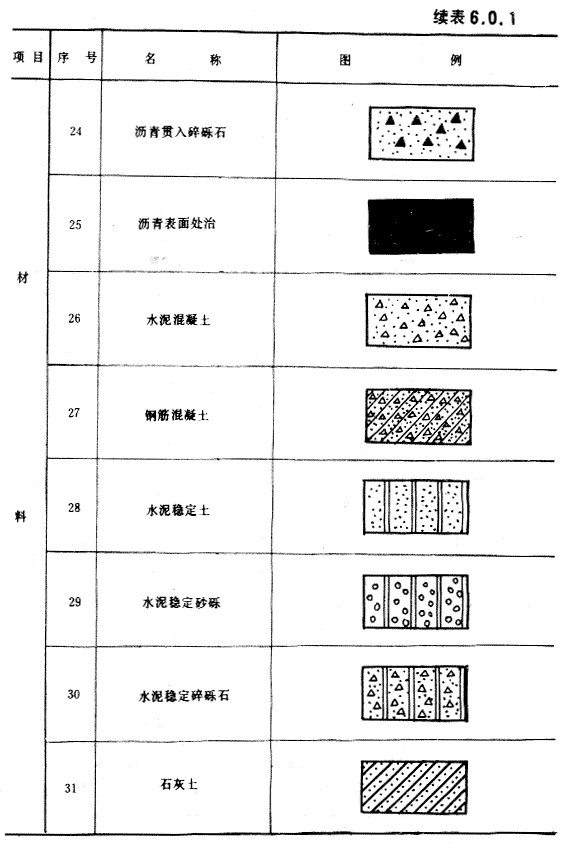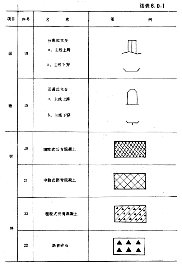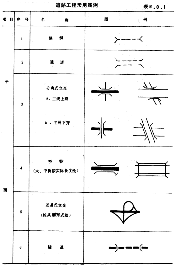 第6.0.1条 道路工程常用图例应符合表6.0.1的规定,使用时,图例线应间隔均匀,疏密适度,对未编制的图例,可自行拟定,但自行拟定的图例不得与本标准所列图例重复,并应在图纸适当位置画出该图例加以说明。